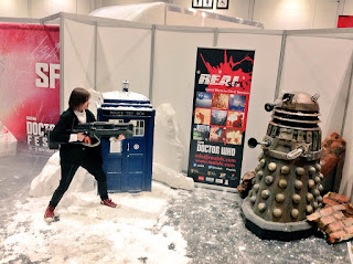 There was a selection of props/costumes from recent episodes including the red velvet coat and guitar. I even bumped into Bernadette chatting to costume design legend Ray Colman, who liked my Mission Dalek. The Millennium FX exhibit (and the panel) was a treasure trove of creativity. After the monster-filled panel I ended up in Level 0 and stumbled upon the 50th Anniversary couch; up ahead was Mark Gatiss talking about Robin Hood movies with a dude. At Production Village I asked Michael Pickwoad about becoming a storyboard artist; he explained pretty much what I had done last month.